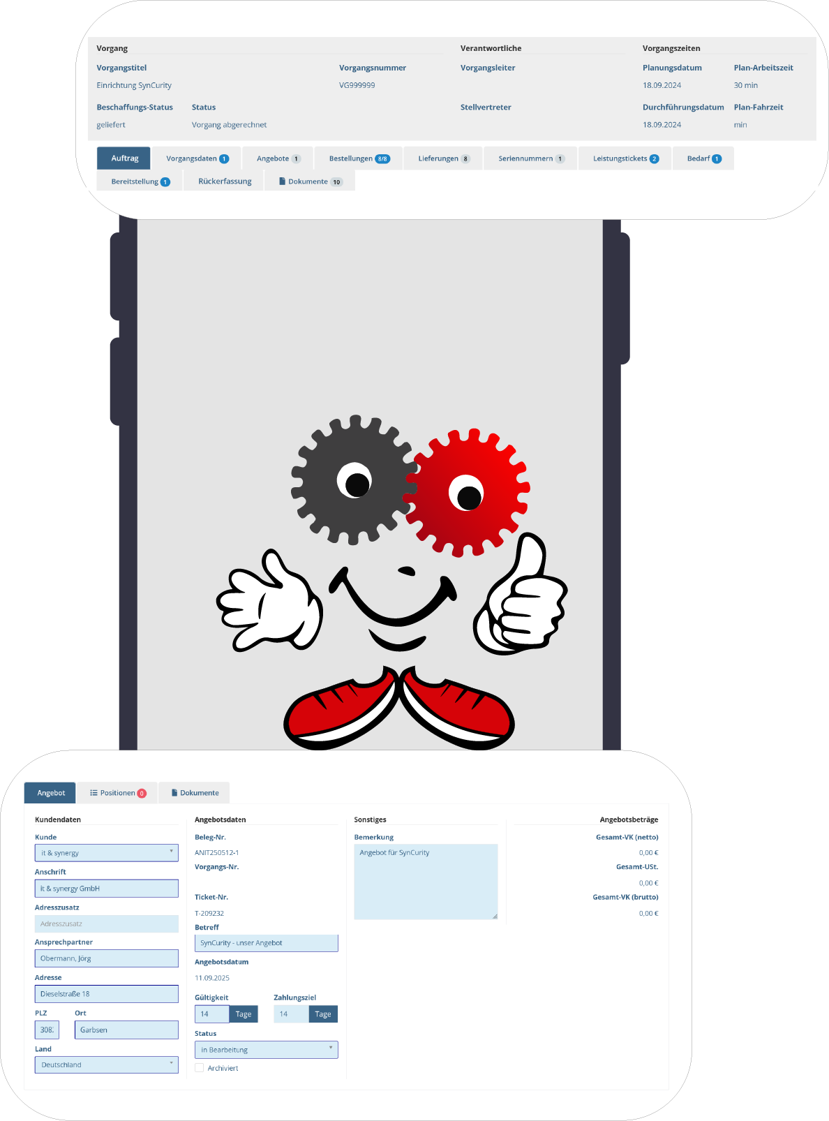 Mit SynDesk steuerst du deinen gesamten Auftragsprozess digital: Von der Angebotserstellung über Auftragserfassung und Materialwirtschaft bis hin zu Bestellwesen, Rechnungsstellung und dem professionellen Ticketsystem – alles in einem zentralen Tool. Zeitersparnis, weniger Fehler und vollständige Prozessübersicht inklusive.